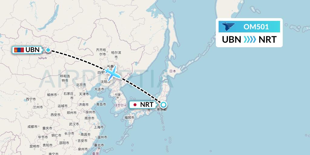MIAT Mongolian Airlines Flight OM501 connects Ulan Bator, Mongolia to Tokyo, Japan, taking off from Chinggis Khaan Ulaanbaatar International Airport UBN and landing at Tokyo Narita International Airport NRT.