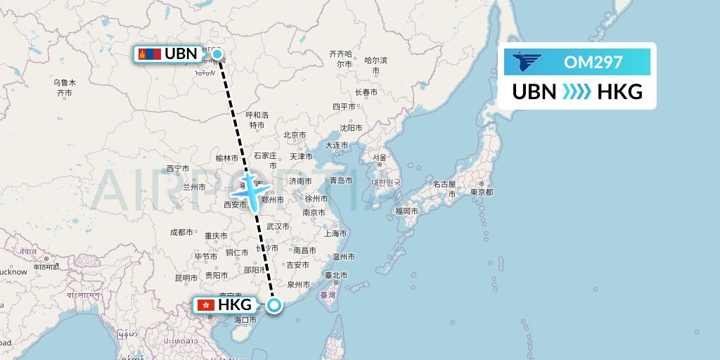 MIAT Mongolian Airlines Flight OM297 connects Ulan Bator, Mongolia to Hong Kong, Hong Kong, taking off from Chinggis Khaan Ulaanbaatar International Airport UBN and landing at Hong Kong International Airport HKG.