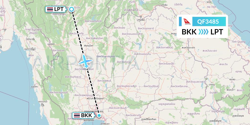 Qantas Flight QF3485 connects Bangkok, Thailand to Lampang, Thailand, taking off from Bangkok Suvarnabhumi Airport BKK and landing at Lampang Airport LPT.