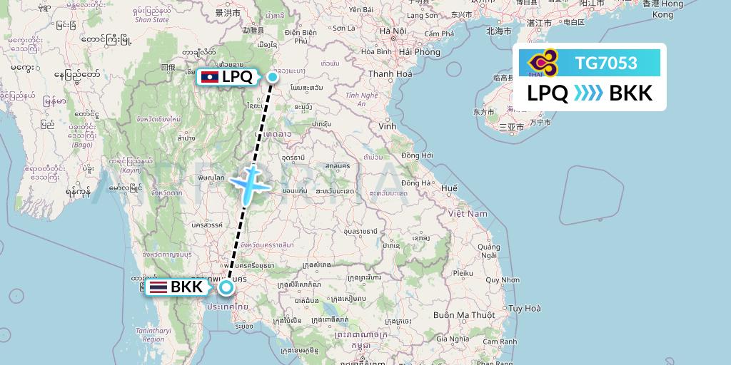 Thai Airways Flight TG7053 connects Luang Prabang, Laos to Bangkok, Thailand, taking off from Luang Prabang International Airport LPQ and landing at Bangkok Suvarnabhumi Airport BKK.