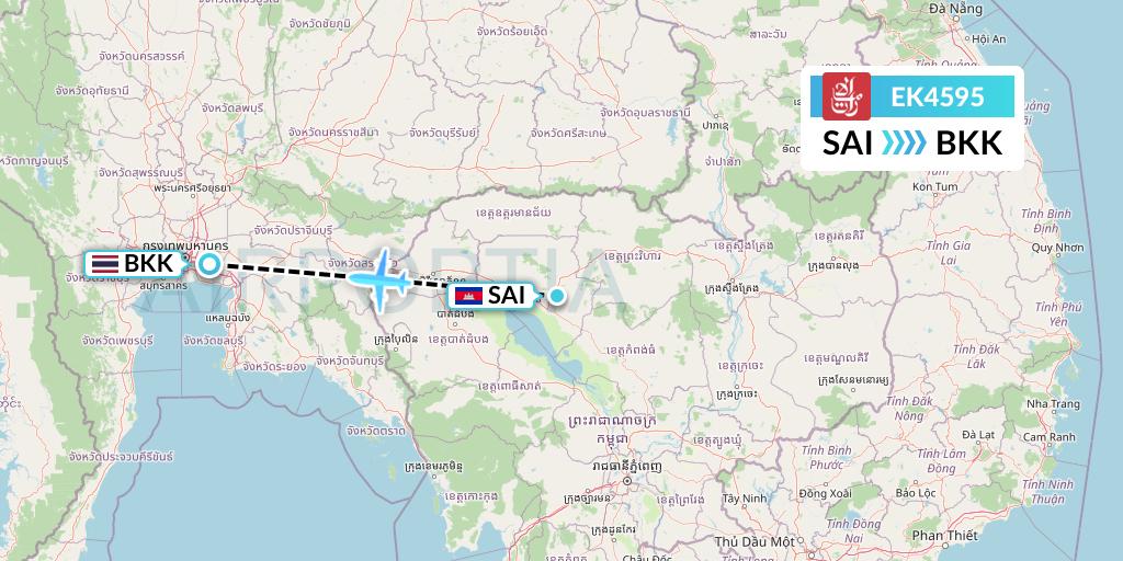 Emirates Flight EK4595 connects Siem Reap, Cambodia to Bangkok, Thailand, taking off from Siem Reap Angkor SAI and landing at Bangkok Suvarnabhumi Airport BKK.