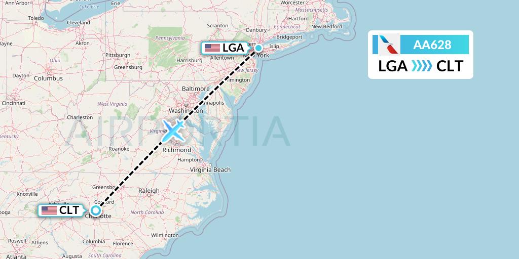 American Airlines Flight AA628 connects New York, United States to Charlotte, United States, taking off from New York LaGuardia Airport LGA and landing at Charlotte Douglas International Airport CLT.