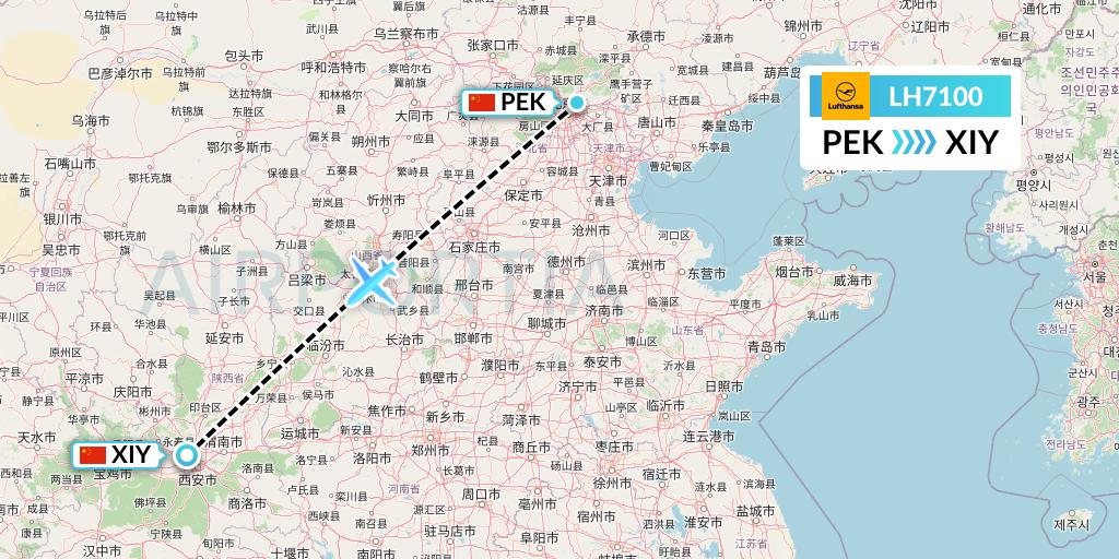 Lufthansa Flight LH7100 connects Beijing, China to Xi'an, China, taking off from Beijing Capital International Airport PEK and landing at Xi'an Xianyang International Airport XIY.