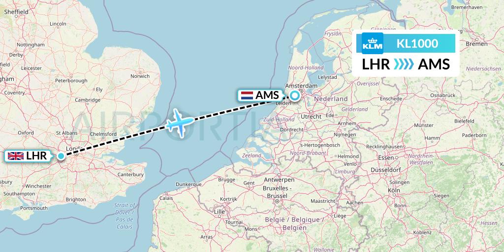 KLM Flight KL1000 connects London, United Kingdom to Amsterdam, Netherlands, taking off from London Heathrow Airport LHR and landing at Amsterdam Schiphol Airport AMS.