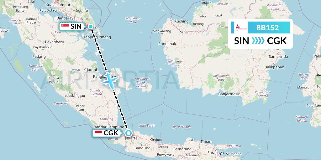 TransNusa Flight 8B152 connects Singapore, Singapore to Jakarta, Indonesia, taking off from Singapore Changi Airport SIN and landing at Jakarta Soekarno Hatta International Airport CGK.