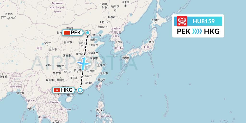 Hainan Airlines Flight HU8159 connects Beijing, China to Hong Kong, Hong Kong, taking off from Beijing Capital International Airport PEK and landing at Hong Kong International Airport HKG.