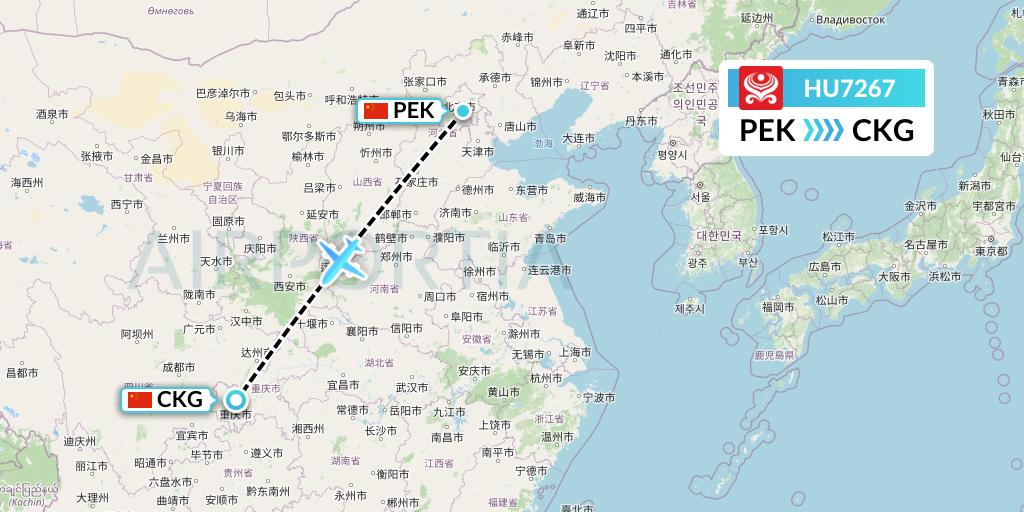 Hainan Airlines Flight HU7267 connects Beijing, China to Chongqing, China, taking off from Beijing Capital International Airport PEK and landing at Chongqing Jiangbei International Airport CKG.