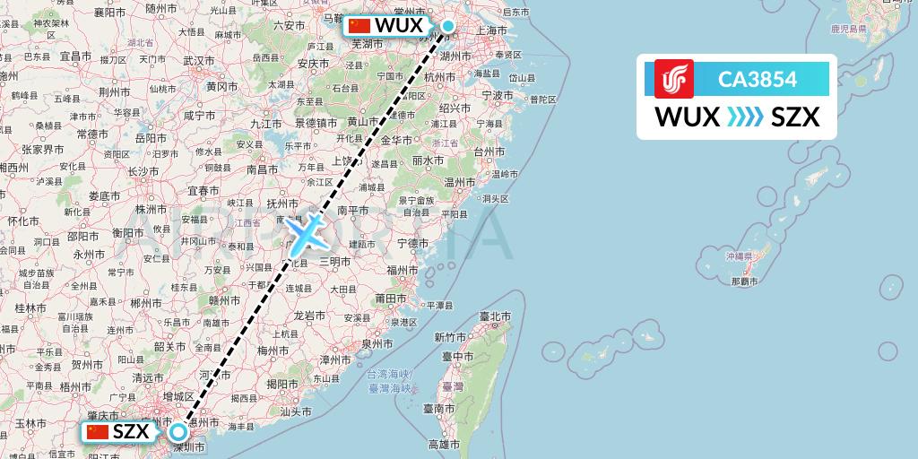 Air China Flight CA3854 connects Wuxi, China to Shenzhen, China, taking off from Wuxi Sunan Shuofang International Airport WUX and landing at Shenzhen Bao'an International Airport SZX.