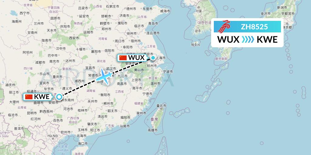 Shenzhen Airlines Flight ZH8525 connects Wuxi, China to Guiyang, China, taking off from Wuxi Sunan Shuofang International Airport WUX and landing at Guiyang Longdongbao International Airport KWE.