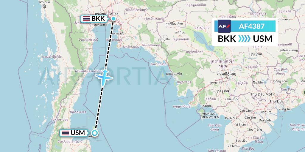 Air France Flight AF4387 connects Bangkok, Thailand to Koh Samui, Thailand, taking off from Bangkok Suvarnabhumi Airport BKK and landing at Koh Samui Airport USM.