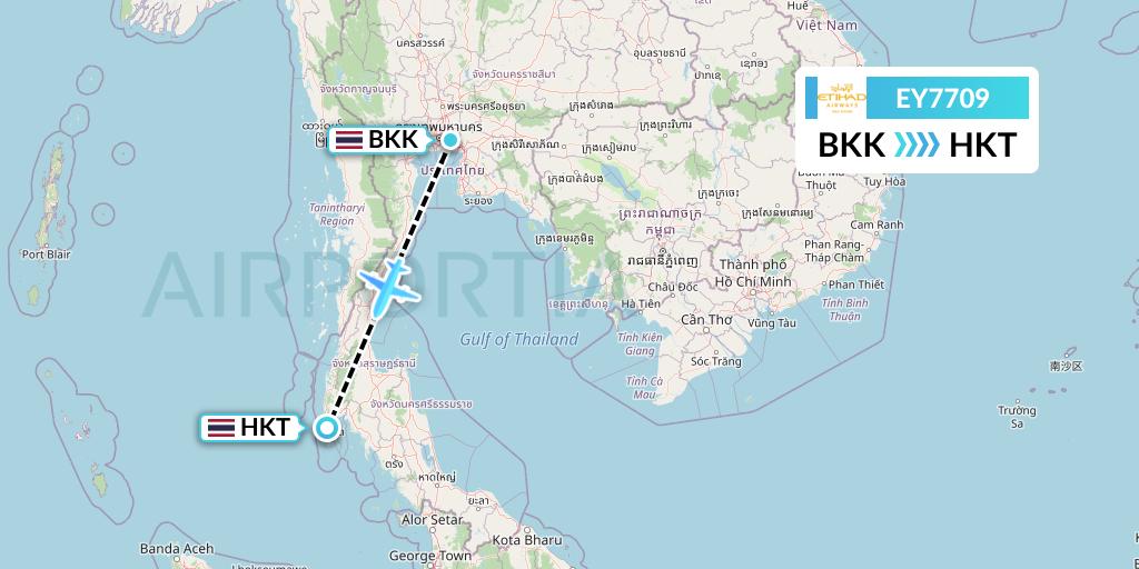 Etihad Airways Flight EY7709 connects Bangkok, Thailand to Phuket, Thailand, taking off from Bangkok Suvarnabhumi Airport BKK and landing at Phuket International Airport HKT.