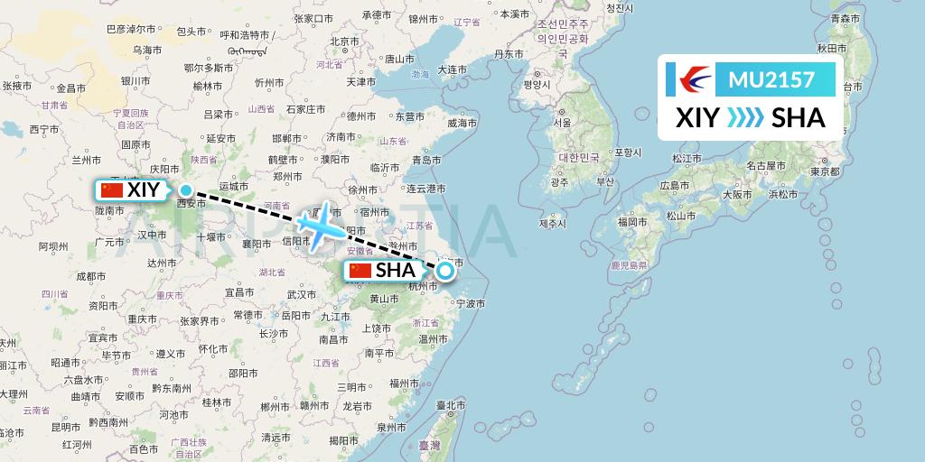 China Eastern Airlines Flight MU2157 connects Xi'an, China to Shanghai, China, taking off from Xi'an Xianyang International Airport XIY and landing at Shanghai Hongqiao International Airport SHA.