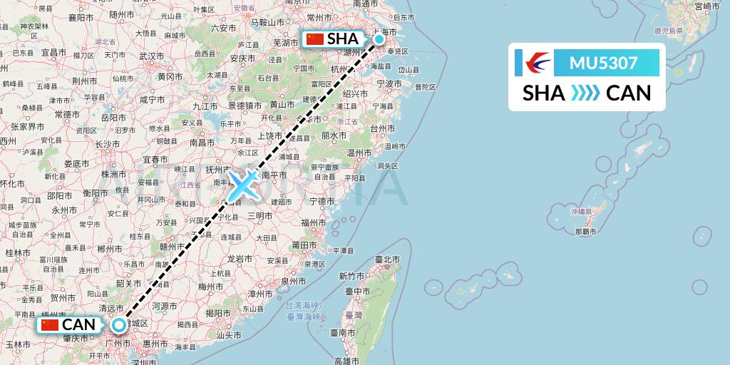 China Eastern Airlines Flight MU5307 connects Shanghai, China to Guangzhou, China, taking off from Shanghai Hongqiao International Airport SHA and landing at Guangzhou Baiyun International Airport CAN.