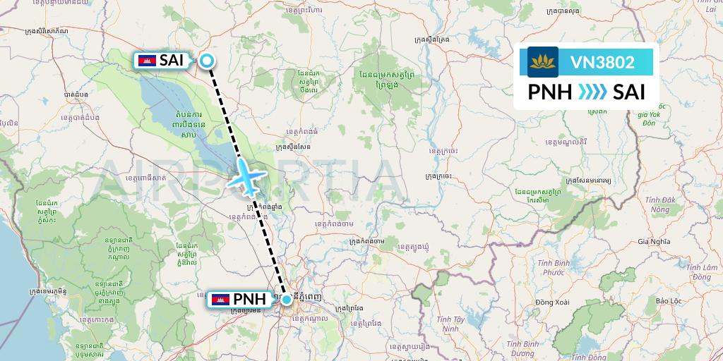 Vietnam Airlines Flight VN3802 connects Phnom Penh, Cambodia to Siem Reap, Cambodia, taking off from Phnom Penh International Airport PNH and landing at Siem Reap Angkor SAI.