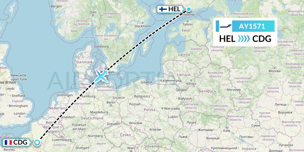 Finnair Flight AY1571 connects Helsinki, Finland to Paris, France, taking off from Helsinki Vantaa Airport HEL and landing at Paris Charles de Gaulle Airport CDG.
