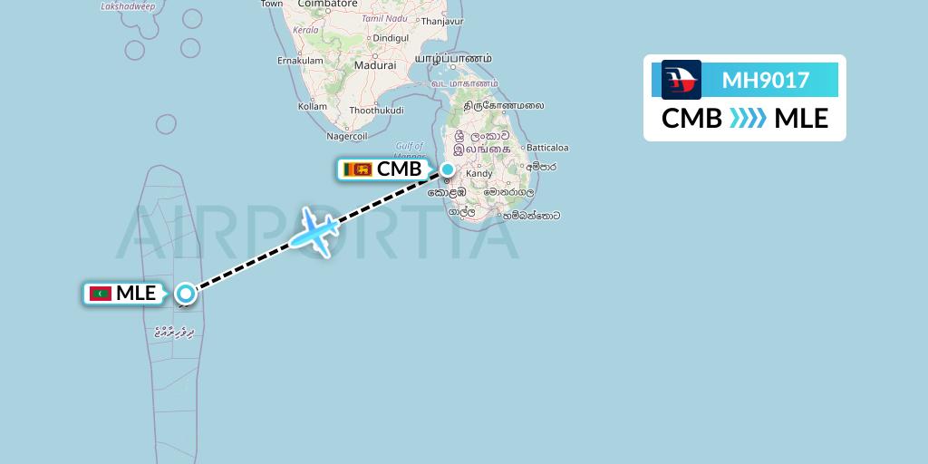 Malaysia Airlines Flight MH9017 connects Colombo, Sri Lanka to Male, Maldives, taking off from Colombo Bandaranaike International Airport CMB and landing at Male Ibrahim Nasir International Airport MLE.