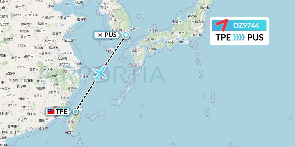 Asiana Airlines Flight OZ9744 connects Taipei, Taiwan to Busan, South Korea, taking off from Taiwan Taoyuan International Airport TPE and landing at Busan Gimhae International Airport PUS.