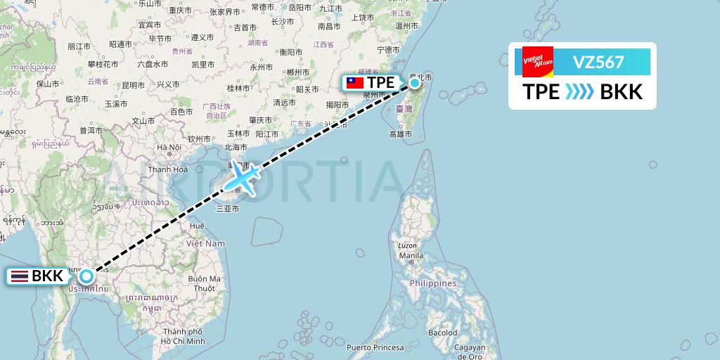 Thai Vietjet Air Flight VZ567 connects Taipei, Taiwan to Bangkok, Thailand, taking off from Taiwan Taoyuan International Airport TPE and landing at Bangkok Suvarnabhumi Airport BKK.