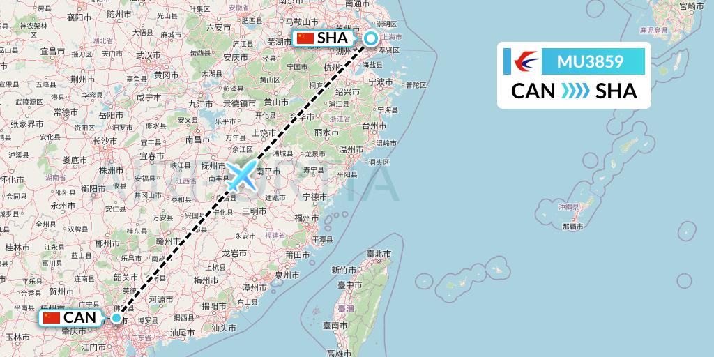 China Eastern Airlines Flight MU3859 connects Guangzhou, China to Shanghai, China, taking off from Guangzhou Baiyun International Airport CAN and landing at Shanghai Hongqiao International Airport SHA.