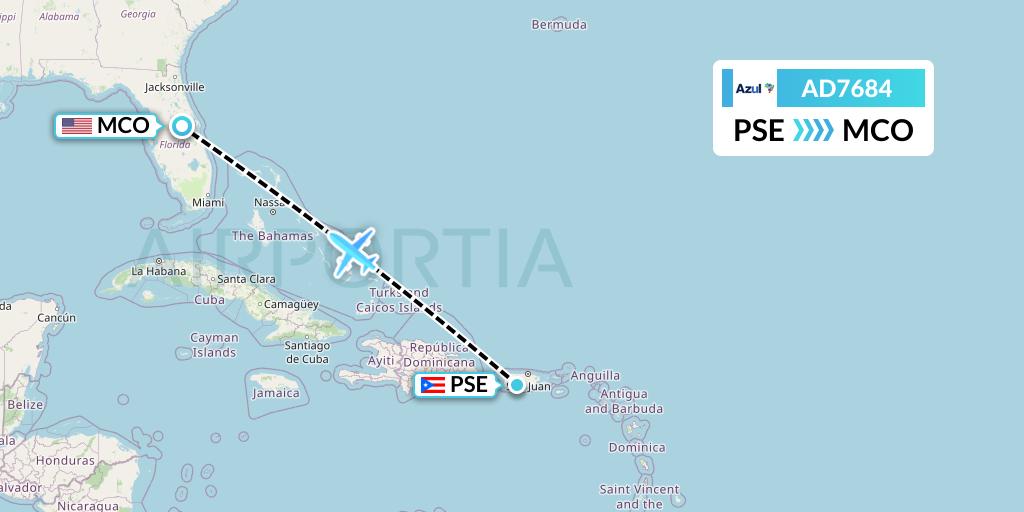 Azul Brazilian Airlines Flight AD7684 connects Ponce, Puerto Rico to Orlando, United States, taking off from Ponce Mercedita Airport PSE and landing at Orlando International Airport MCO.