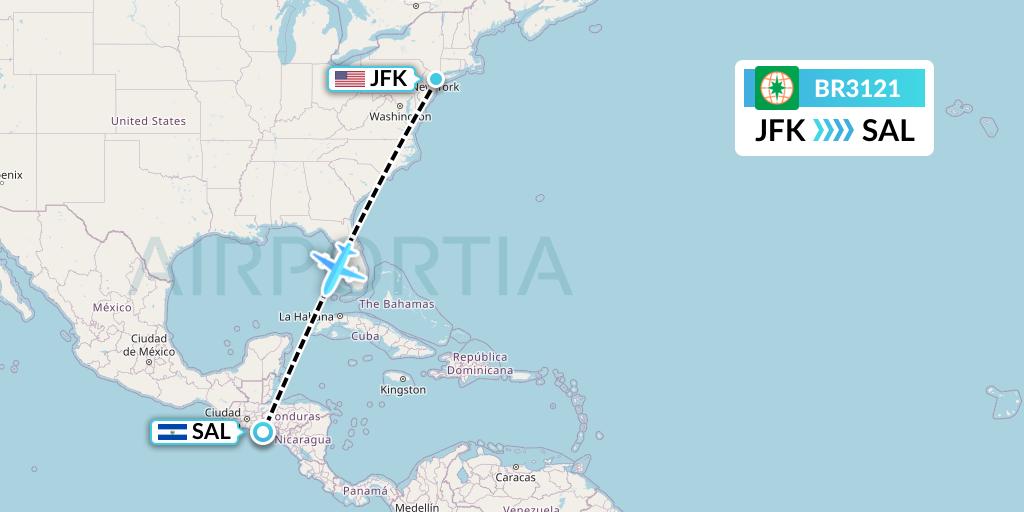 EVA Air Flight BR3121 connects New York, United States to San Salvador, El Salvador, taking off from New York John F. Kennedy International Airport JFK and landing at San Salvador International Airport SAL.