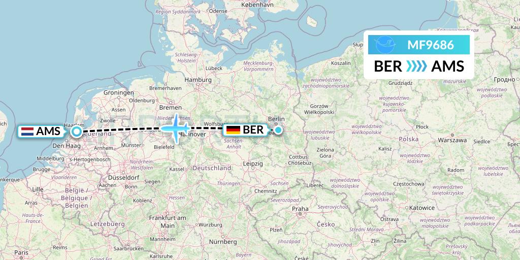 Xiamen Airlines Flight MF9686 connects Berlin, Germany to Amsterdam, Netherlands, taking off from Berlin Brandenburg BER and landing at Amsterdam Schiphol Airport AMS.