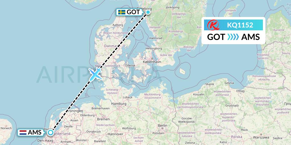 Kenya Airways Flight KQ1152 connects Gothenburg, Sweden to Amsterdam, Netherlands, taking off from Gothenburg Landvetter Airport GOT and landing at Amsterdam Schiphol Airport AMS.