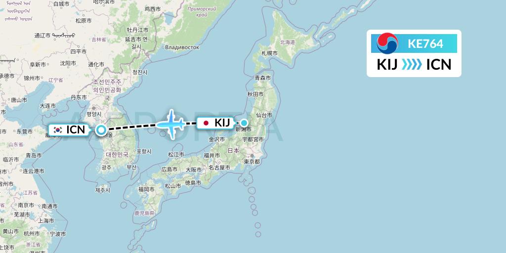 Korean Air Flight KE764 connects Niigata, Japan to Seoul, South Korea, taking off from Niigata Airport KIJ and landing at Seoul Incheon International Airport ICN.