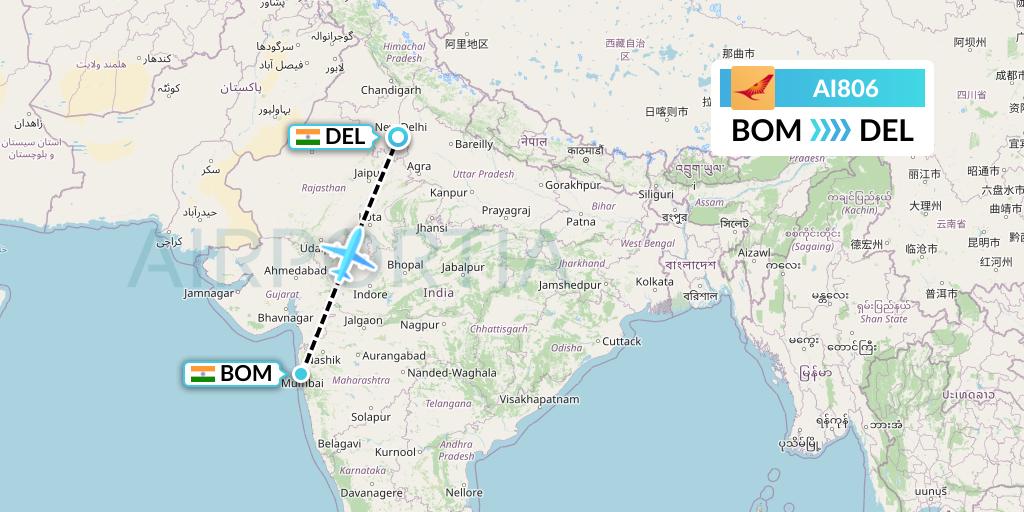 Air India Flight AI806 connects Mumbai, India to Delhi, India, taking off from Mumbai Chhatrapati Shivaji International Airport BOM and landing at Delhi Indira Gandhi International Airport DEL.