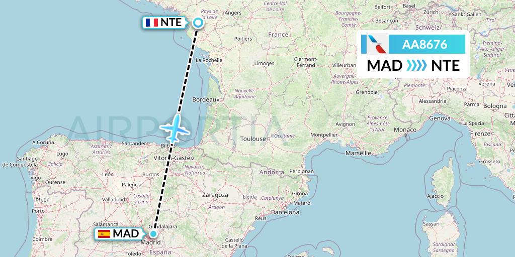 American Airlines Flight AA8676 connects Madrid, Spain to Nantes, France, taking off from Madrid Barajas Airport MAD and landing at Nantes Atlantique Airport NTE.