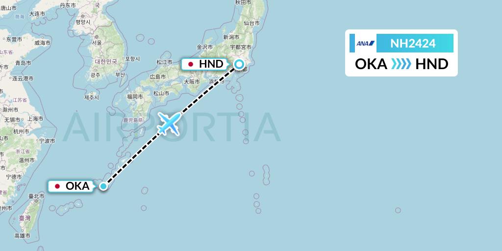 All Nippon Airways Flight NH2424 connects Naha, Japan to Tokyo, Japan, taking off from Naha Airport OKA and landing at Tokyo Haneda International Airport HND.