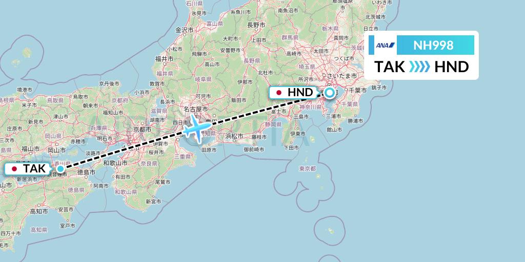 All Nippon Airways Flight NH998 connects Takamatsu, Japan to Tokyo, Japan, taking off from Takamatsu Airport TAK and landing at Tokyo Haneda International Airport HND.