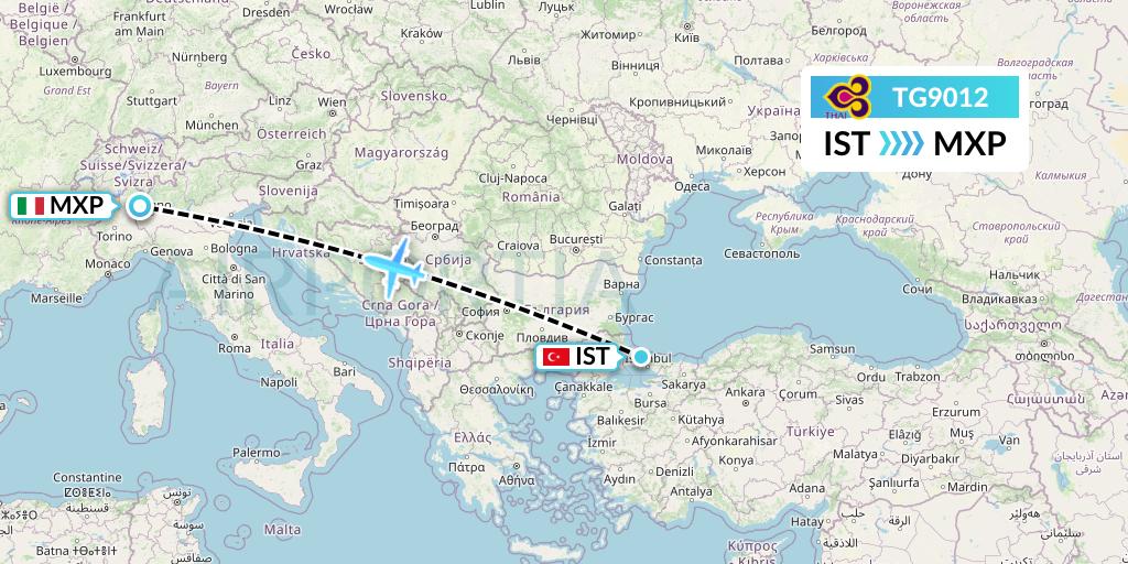 Thai Airways Flight TG9012 connects Istanbul, Turkey to Milan, Italy, taking off from Istanbul Airport IST and landing at Milan Malpensa Airport MXP.