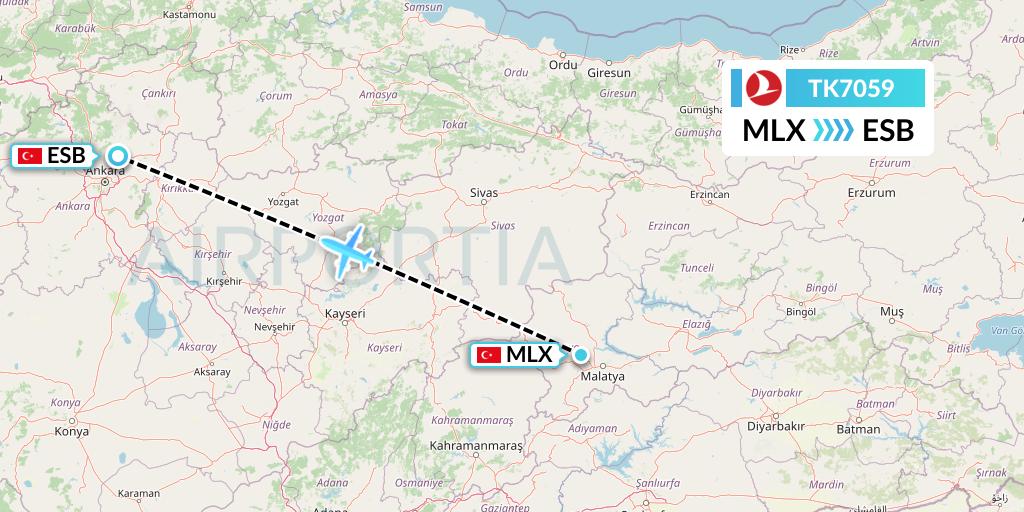 Turkish Airlines Flight TK7059 connects Malatya, Turkey to Ankara, Turkey, taking off from Malatya Erhac Airport MLX and landing at Ankara Esenboga International Airport ESB.