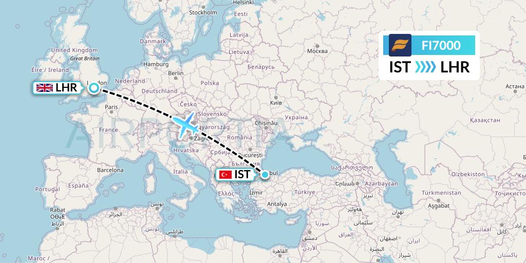 Icelandair Flight FI7000 connects Istanbul, Turkey to London, United Kingdom, taking off from Istanbul Airport IST and landing at London Heathrow Airport LHR.