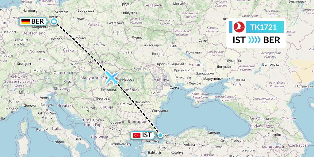 Turkish Airlines Flight TK1721 connects Istanbul, Turkey to Berlin, Germany, taking off from Istanbul Airport IST and landing at Berlin Brandenburg BER.