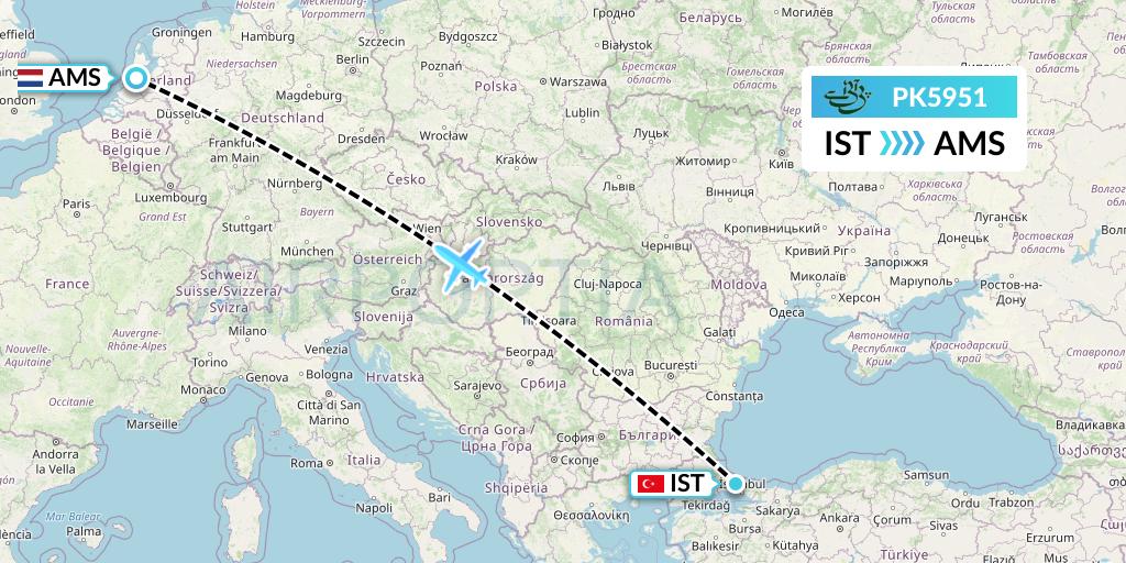 Pakistan International Airlines Flight PK5951 connects Istanbul, Turkey to Amsterdam, Netherlands, taking off from Istanbul Airport IST and landing at Amsterdam Schiphol Airport AMS.