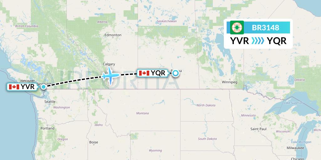 EVA Air Flight BR3148 connects Vancouver, Canada to Regina, Canada, taking off from Vancouver International Airport YVR and landing at Regina International Airport YQR.