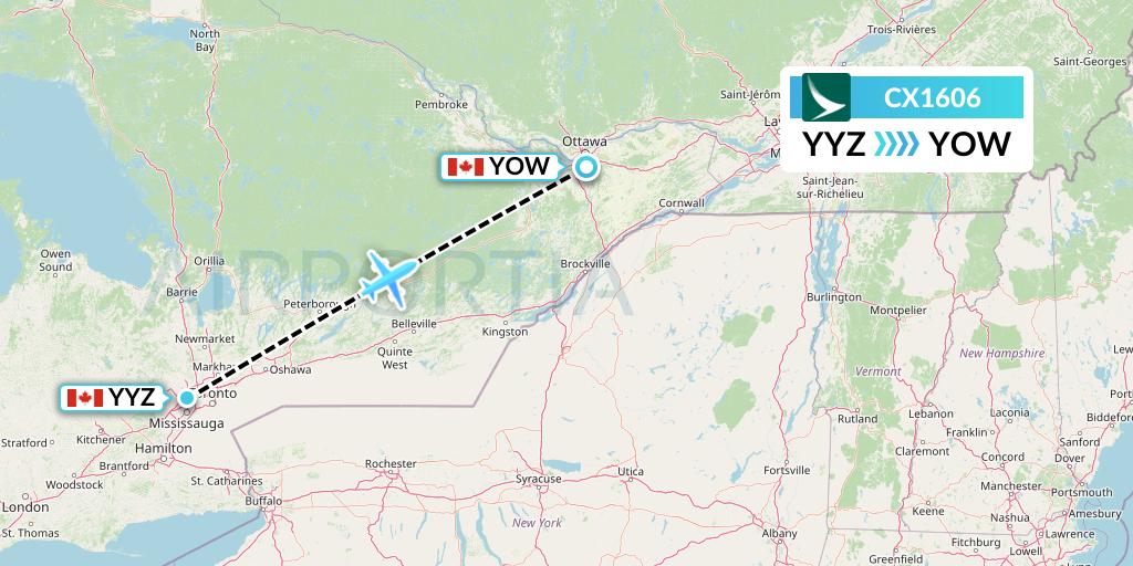 Cathay Pacific Flight CX1606 connects Toronto, Canada to Ottawa, Canada, taking off from Toronto Pearson International Airport YYZ and landing at Ottawa Macdonald-Cartier International Airport YOW.