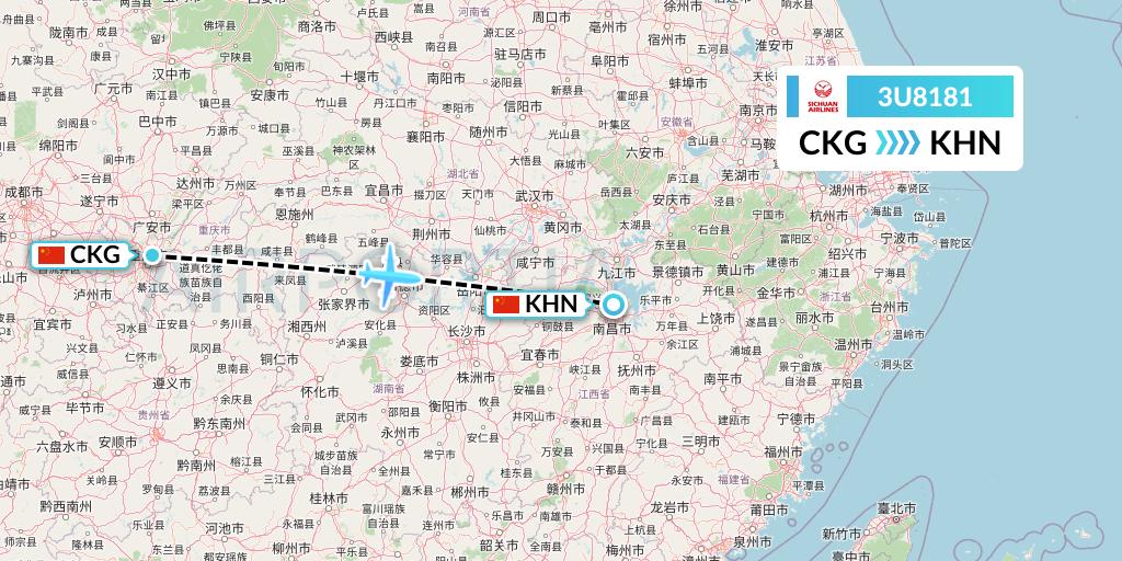Sichuan Airlines Flight 3U8181 connects Chongqing, China to Nanchang, China, taking off from Chongqing Jiangbei International Airport CKG and landing at Nanchang Changbei International Airport KHN.