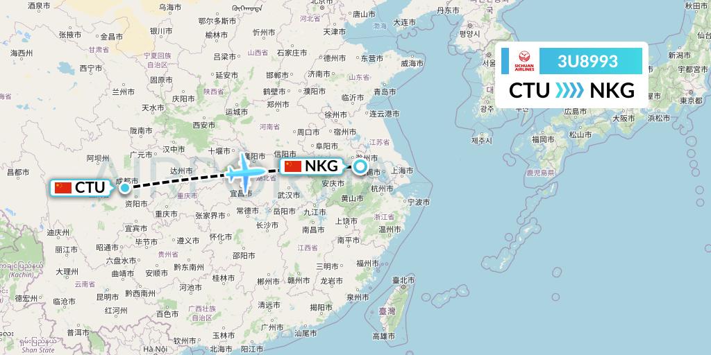 Sichuan Airlines Flight 3U8993 connects Chengdu, China to Nanjing, China, taking off from Chengdu Shuangliu International Airport CTU and landing at Nanjing Lukou International Airport NKG.