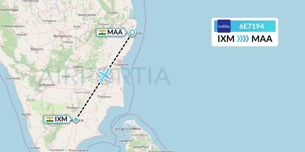 IndiGo Airlines Flight 6E7194 connects Madurai, India to Chennai, India, taking off from Madurai Airport IXM and landing at Chennai International Airport MAA.